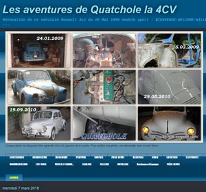 Les aventures de Quatchole la 4cv ![]() Semaines après semaines, les étapes de rénovation d'une 4cv modèle sport de 1959 : photos, vidéos, diverses rubriques. venez visiter ce blog, laissez votre commentaire ou signez le livre d'or. >> Visiter le site |